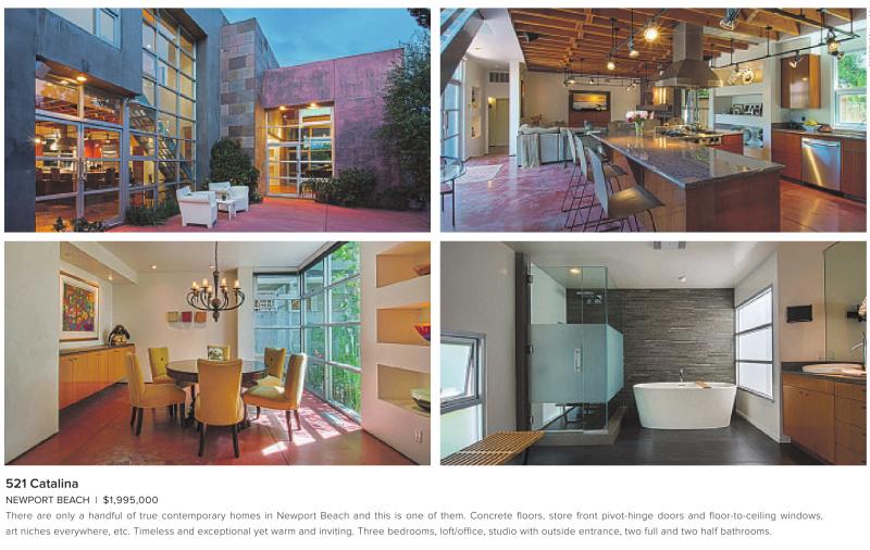 NEWPORT BEACH | $1,995,000 There are only a handful of true contemporary homes in Newport Beach and this is one of them. Concrete floors, store front pivot-hinge doors and floor-to-ceiling windows, art niches everywhere, etc. Timeless and exceptional yet warm and inviting. Three bedrooms, loft/office, studio with outside entrance, two full and two half bathrooms.