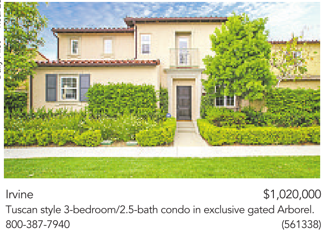 Irvine $1,020,000 Tuscan style 3-bedroom/2.5-bath condo in exclusive gated Arborel. 800-387-7940 (561338)