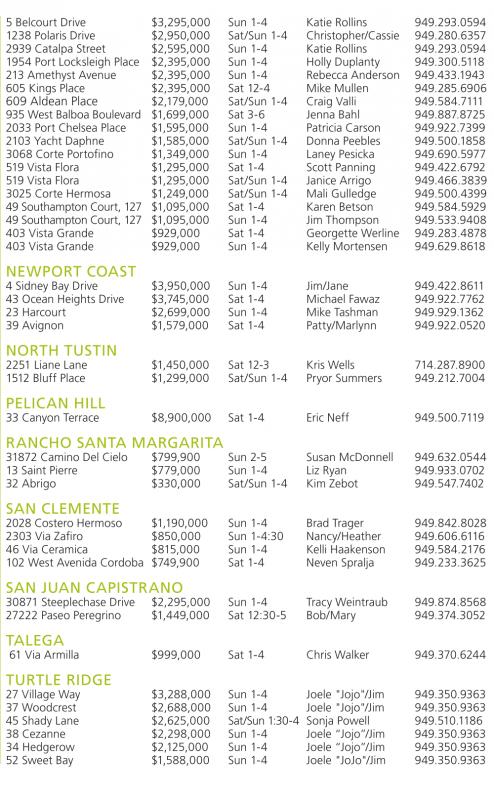 5 Belcourt Drive $3,295,000 Sun 1-4 Katie Rollins 949.293.0594 1238 Polaris Drive $2,950,000 Sat/Sun 1-4 Christopher/Cassie 949.280.6357 2939 Catalpa Street $2,595,000 Sun 1-4 Katie Rollins 949.293.0594 1954 Port Locksleigh Place $2,395,000 Sun 1-4 Holly Duplanty 949.300.5118 213 Amethyst Avenue $2,395,000 Sun 1-4 Rebecca Anderson 949.433.1943 605 Kings Place $2,395,000 Sat 12-4 Mike Mullen 949.285.6906 609 Aldean Place $2,179,000 Sat/Sun 1-4 Craig Valli 949.584.7111 935 West Balboa Boulevard $1,699,000 Sat 3-6 Jenna Bahl 949.887.8725 2033 Port Chelsea Place $1,595,000 Sun 1-4 Patricia Carson 949.922.7399 2103 Yacht Daphne $1,585,000 Sat/Sun 1-4 Donna Peebles 949.500.1858 3068 Corte Portofino $1,349,000 Sun 1-4 Laney Pesicka 949.690.5977 519 Vista Flora $1,295,000 Sat 1-4 Scott Panning 949.422.6792 519 Vista Flora $1,295,000 Sat/Sun 1-4 Janice Arrigo 949.466.3839 3025 Corte Hermosa $1,249,000 Sat/Sun 1-4 Mali Gulledge 949.500.4399 49 Southampton Court, 127 $1,095,000 Sat 1-4 Karen Betson 949.584.5929 49 Southampton Court, 127 $1,095,000 Sun 1-4 Jim Thompson 949.533.9408 403 Vista Grande $929,000 Sat 1-4 Georgette Werline 949.283.4878 403 Vista Grande $929,000 Sun 1-4 Kelly Mortensen 949.629.8618 NEWPORT COAST 4 Sidney Bay Drive $3,950,000 Sun 1-4 Jim/Jane 949.422.8611 43 Ocean Heights Drive $3,745,000 Sat 1-4 Michael Fawaz 949.922.7762 23 Harcourt $2,699,000 Sun 1-4 Mike Tashman 949.929.1362 39 Avignon $1,579,000 Sat 1-4 Patty/Marlynn 949.922.0520 NORTH TUSTIN 2251 Liane Lane $1,450,000 Sat 12-3 Kris Wells 714.287.8900 1512 Bluff Place $1,299,000 Sat/Sun 1-4 Pryor Summers 949.212.7004 PELICAN HILL 33 Canyon Terrace $8,900,000 Sat 1-4 Eric Neff 949.500.7119 RANCHO SANTA MARGARITA 31872 Camino Del Cielo $799,900 Sun 2-5 Susan McDonnell 949.632.0544 13 Saint Pierre $779,000 Sun 1-4 Liz Ryan 949.933.0702 32 Abrigo $330,000 Sat/Sun 1-4 Kim Zebot 949.547.7402 SAN CLEMENTE 2028 Costero Hermoso $1,190,000 Sun 1-4 Brad Trager 949.842.8028 2303 Via Zafiro $850,000 Sun 1-4:30 Nancy/Heather 949.606.6116 46 Via Ceramica $815,000 Sun 1-4 Kelli Haakenson 949.584.2176 102 West Avenida Cordoba $749,900 Sat 1-4 Neven Spralja 949.233.3625 SAN JUAN CAPISTRANO 30871 Steeplechase Drive $2,295,000 Sun 1-4 Tracy Weintraub 949.874.8568 27222 Paseo Peregrino $1,449,000 Sat 12:30-5 Bob/Mary 949.374.3052 TALEGA 61 Via Armilla $999,000 Sat 1-4 Chris Walker 949.370.6244 TURTLE RIDGE 27 Village Way $3,288,000 Sun 1-4 Joele "Jojo"/Jim 949.350.9363 37 Woodcrest $2,688,000 Sun 1-4 Joele "Jojo"/Jim 949.350.9363 45 Shady Lane $2,625,000 Sat/Sun1:30-4 Sonja Powell 949.510.1186 38 Cezanne $2,298,000 Sun 1-4 Joele “Jojo”/Jim 949.350.9363 34 Hedgerow $2,125,000 Sun 1-4 Joele “Jojo”/Jim 949.350.9363 52 Sweet Bay $1,588,000 Sun 1-4 Joele "JoJo"/Jim 949.350.9363