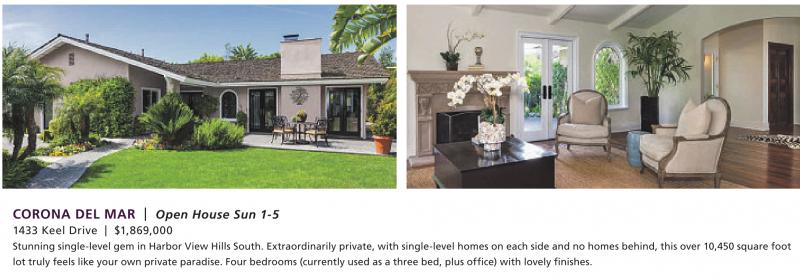 CORONA DEL MAR | Open House Sun 1-5 1433 Keel Drive | $1,869,000 Stunning single-level gem in Harbor View Hills South. Extraordinarily private, with single-level homes on each side and no homes behind, this over 10,450 square foot lot truly feels like your own private paradise. Four bedrooms (currently used as a three bed, plus office) with lovely finishes.