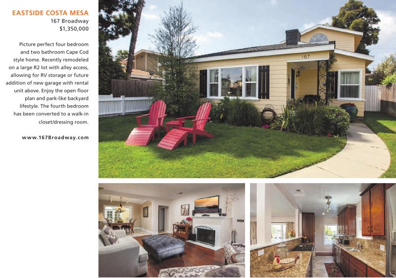 EASTSIDE COSTA MESA 167 Broadway $1,350,000 Picture perfect four bedroom and two bathroom Cape Cod style home. Recently remodeled on a large R2 lot with alley access, allowing for RV storage or future addition of new garage with rental unit above. Enjoy the open floor plan and park-like backyard lifestyle. The fourth bedroom has been converted to a walk-in closet/dressing room. www.167Broadway.com