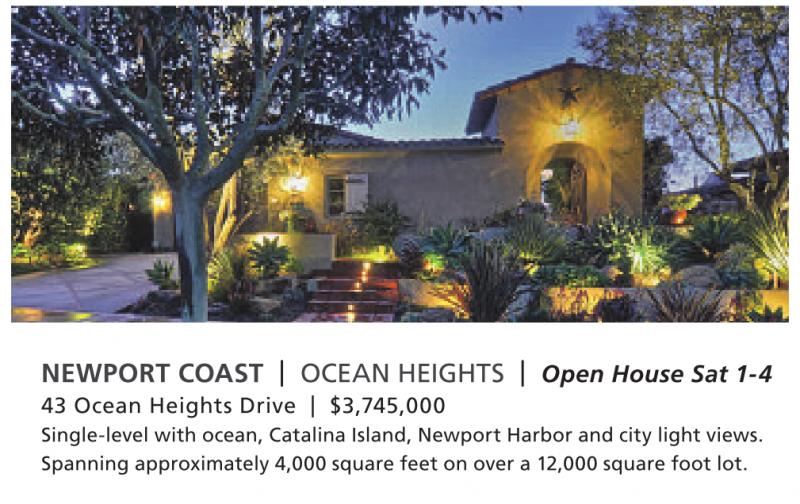NEWPORT COAST | OCEAN HEIGHTS | Open House Sat 1-4 43 Ocean Heights Drive | $3,745,000 Single-level with ocean, Catalina Island, Newport Harbor and city light views. Spanning approximately 4,000 square feet on over a 12,000 square foot lot.