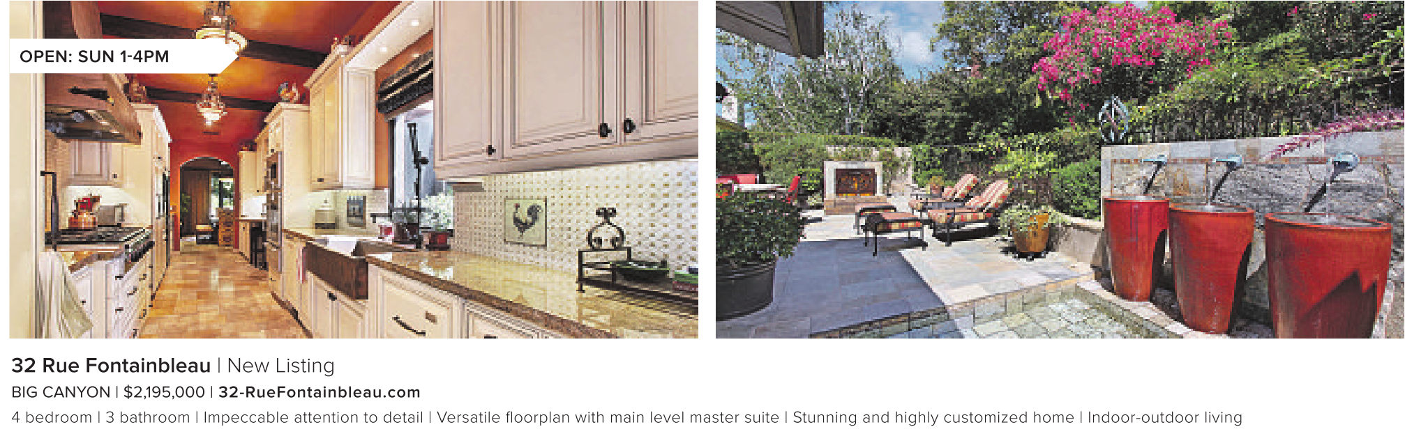 OPEN: SUN 1-4PM 32 Rue Fontainbleau | New Listing BIG CANYON | $2,195,000 | 32-RueFontainbleau.com 4 bedroom | 3 bathroom | Impeccable attention to detail | Versatile floorplan with main level master suite | Stunning and highly customized home | Indoor-outdoor living See also