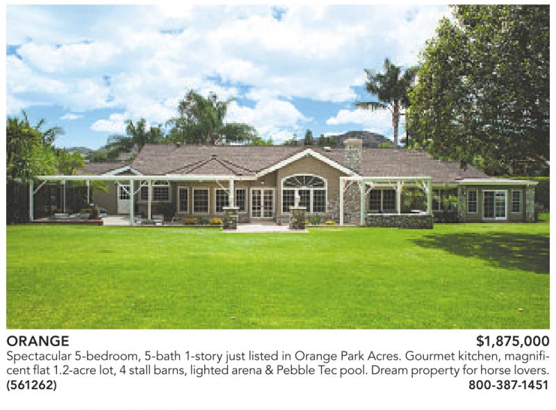 ORANGE $1,875,000 Spectacular 5-bedroom, 5-bath 1-story just listed in Orange Park Acres. Gourmet kitchen, magnificent flat1.2-acrelot, 4stall barns, lightedarena &PebbleTec pool.Dream property forhorse lovers.