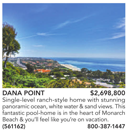 DANA POINT $2,698,800 Single-level ranch-style home with stunning panoramicocean,white water&sand views. This fantastic pool-home is in the heart of Monarch Beach&you’llfeellikeyou’reonvacation. (561162) 800-387-1447
