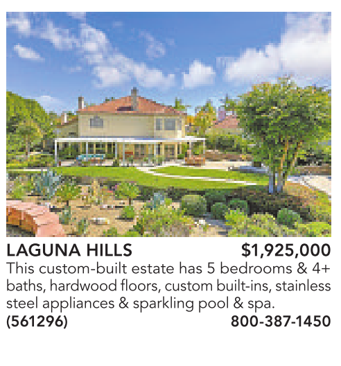 LAGUNA HILLS $1,925,000 This custom-built estate has 5 bedrooms & 4+ baths, hardwood floors, custom built-ins,stainless steelappliances&sparkling pool &spa. (561296) 800-387-1450