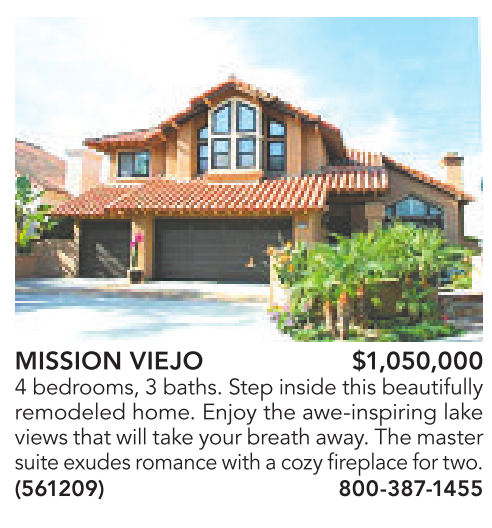 MISSION VIEJO $1,050,000 4bedrooms, 3baths.Stepinsidethisbeautifully remodeled home. Enjoy the awe-inspiring lake viewsthat will take your breathaway. Themaster suiteexudesromance with acozyfireplace fortwo. (561209) 800-387-1455