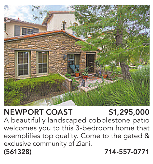 NEWPORT COAST $1,295,000 A beautifully landscaped cobblestone patio welcomes you to this 3-bedroom home that exemplifies top quality. Come to the gated & exclusivecommunity of Ziani. (561328) 714-557-0771