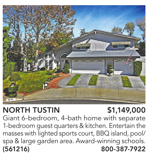 NORTH TUSTIN $1,149,000 Giant 6-bedroom, 4-bath home with separate 1-bedroom guestquarters &kitchen.Entertainthe masses with lightedsportscourt,BBQ island,pool/ spa&largegarden area. Award-winningschools. (561216) 800-387-7922