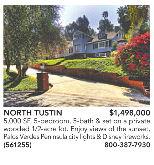 NORTH TUSTIN $1,498,000 5,000 SF, 5-bedroom, 5-bath & set on a private wooded 1/2-acre lot. Enjoy views of the sunset, PalosVerdes Peninsula citylights&Disneyfireworks. (561255) 800-387-7930