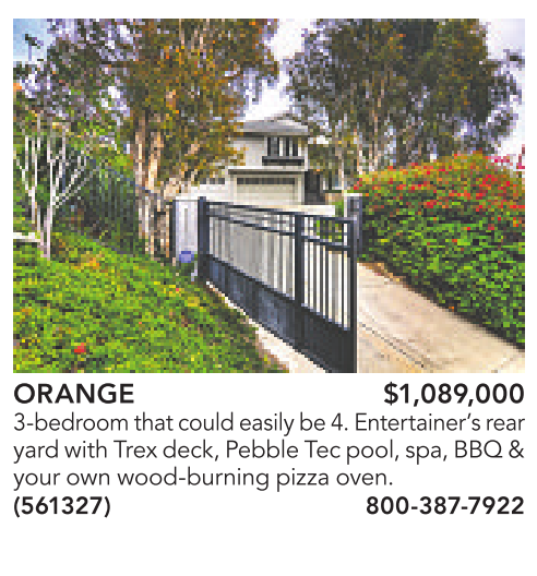 ORANGE $1,089,000 3-bedroom that couldeasilybe4.Entertainer’srear yard with Trex deck,PebbleTec pool,spa,BBQ & your ownwood-burning pizzaoven. (561327) 800-387-7922