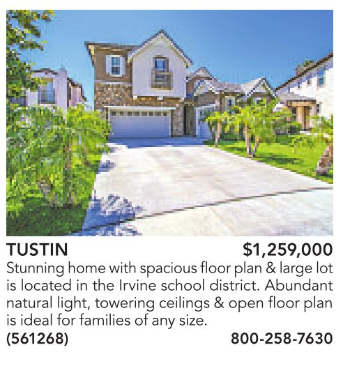 TUSTIN $1,259,000 Stunning home with spacious floor plan &largelot is located in the Irvine school district. Abundant natural light, towering ceilings&openfloorplan is idealfor families of anysize. (561268) 800-258-7630