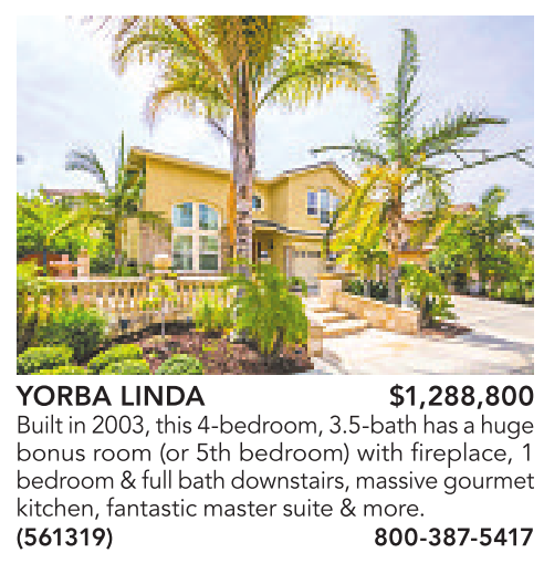 YORBA LINDA $1,288,800 Builtin2003, this 4-bedroom,3.5-bathhas ahuge bonus room (or 5th bedroom) with fireplace, 1 bedroom &fullbathdownstairs, massivegourmet kitchen, fantasticmastersuite &more. (561319) 800-387-5417