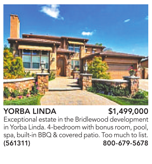 YORBA LINDA $1,499,000 Exceptionalestateinthe Bridlewooddevelopment in YorbaLinda.4-bedroom with bonusroom,pool, spa, built-in BBQ&coveredpatio.Too muchtolist. (561311) 800-679-5678
