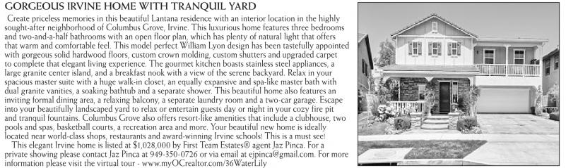 This elegant Irvine home is listed at $1,028,000 by First Team Estates® agent Jaz Pinca. For a private showing please contact Jaz Pinca at 949-350-0726 or via email at ejpinca@gmail.com. For more information please visit the virtual tour - www.myOCrealtor.com/36WaterLily