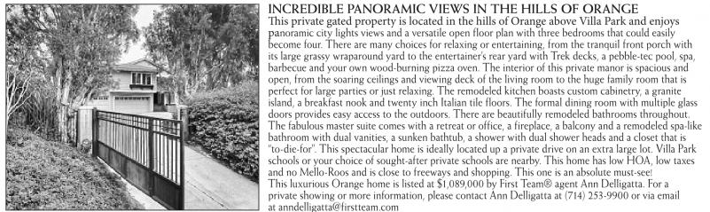 This private gated property is located in the hills of Orange above Villa Park and enjoys panoramic city lights views and a versatile open floor plan with three bedrooms that could easily become four. There are many choices for relaxing or entertaining, from the tranquil front porch with its large grassy wraparound yard to the entertainer’s rear yard with Trek decks, a pebble-tec pool, spa, barbecue and your own wood-burning pizza oven. The interior of this private manor is spacious and open, from the soaring ceilings and viewing deck of the living room to the huge family room that is perfect for large parties or just relaxing. The remodeled kitchen boasts custom cabinetry, a granite island, a breakfast nook and twenty inch Italian tile floors. The formal dining room with multiple glass doors provides easy access to the outdoors. There are beautifully remodeled bathrooms throughout. The fabulous master suite comes with a retreat or office, a fireplace, a balcony and a remodeled spa-like bathroom with dual vanities, a sunken bathtub, a shower with dual shower heads and a closet that is “to-die-for”. This spectacular home is ideally located up a private drive on an extra large lot. Villa Park schools or your choice of sought-after private schools are nearby. This home has low HOA, low taxes and no Mello-Roos and is close to freeways and shopping. This one is an absolute must-see! This luxurious Orange home is listed at $1,089,000 by First Team® agent Ann Delligatta. For a private showing or more information, please contact Ann Delligatta at (714) 253-9900 or via email at anndelligatta@firstteam.com