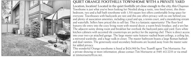 Location, location! Located in the quiet foothills yet close enough to the city, this Chapman Townhome is just what you’ve been looking for! Nestled along a rustic, tree-lined street, this threebedroom, two-and-a-half bath townhome with 1,510 square feet offers comfortable living space for everyone. Townhouses with backyards are rare and this one offers privacy with no one behind you and plenty of association amenities, including a pool and spa, a tennis court, and a meandering stream and waterfalls. Sellers have priced this to sell fast. This is a fantastic opportunity! The floor level features tile entry into the cozy living room with neutral decor, a warm brick fireplace, and a wet bar. The adjacent sunny dining room and breakfast bar overlook the backyard patio and yard. Euro white kitchen cabinets with accented tile countertops are perfect for the aspiring chef. There is direct access into your two-car attached garage. The large master suite features vaulted beam ceilings, a ceiling fan, a mirrored wardrobe, and a huge walk-in closet. The master bathroom boasts a large Roman bathtub and dual vanities. The generously-sized secondary bedrooms are located away from the master suite for added privacy. This wonderful Orange townhome is listed at $424,900 by First Team® agent Tim Morissette. For a private showing or more information, please contact Tim Morissette at (949) 412-2233 or via email at timmorissette@cox.net.