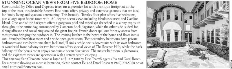 Surrounded by Olive and Cypress trees on a premier lot with a unique footprint at the top of the tract, this desirable Reserve East home offers privacy and extensive grounds that are ideal for family living and spacious entertaining. This beautiful Trestles floor plan offers five bedrooms, plus a large open bonus room with 180-degree ocean views including fabulous sunsets and Catalina Island. One side of the backyard offers a gorgeous pool and raised spa drenched in a sunny exposure throughout the entire day, surrounded by Cameron Rock flagstone, while the other side is ideal for dining alfresco and socializing around the giant fire pit. French doors spill out for easy access from most rooms bringing the outdoors in. The inviting kitchen is the heart of the home and flows into a sun- drenched breakfast room and a wide open great room. Two secondary bedrooms have private bathrooms and two bedrooms share Jack and Jill sinks, while one is downstairs with its own bathroom. A wonderful front balcony for two bedrooms offers special views of The Reserve Hills, while the back balcony off the bonus room enjoys panoramic ocean blue views. The master bedroom is glamorous and the expansive views are spectacular with a retreat worth enjoying. This amazing San Clemente home is listed at $1,575,000 by First Team® agents Evi and Darel Rosen. For a private showing or more information, please contact Evi and Darel Rosen at (949) 291-5088 or via email at rosen@firstteam.com.