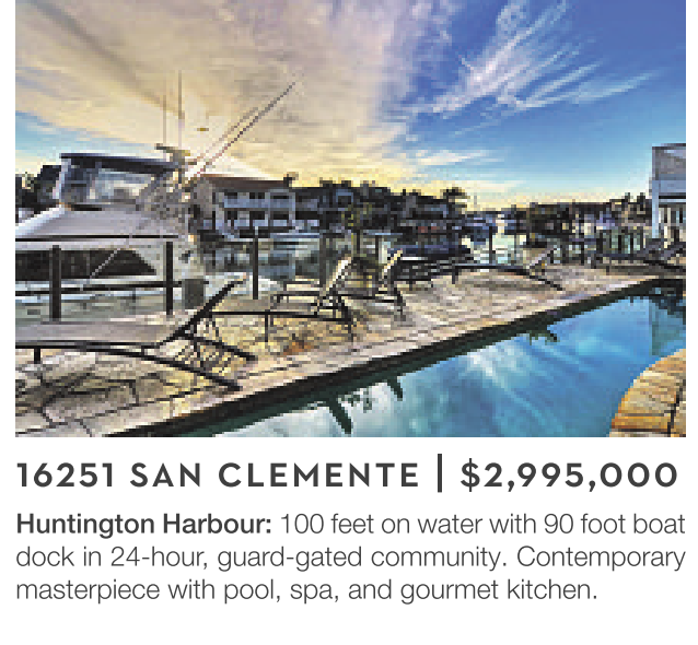 Huntington Harbour: 100 feet on water with 90 foot boat dock in 24-hour, guard-gated community. Contemporary masterpiece with pool, spa, and gourmet kitchen.