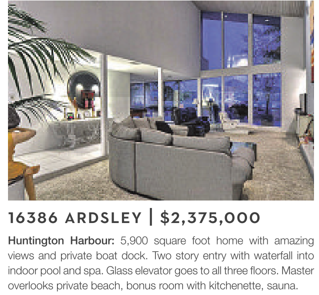 16386 ARDSLEY | $2,375,000 Huntington Harbour: 5,900 square foot home with amazing views and private boat dock. Two story entry with waterfall into indoor pool and spa. Glass elevator goes to all three floors. Master overlooks private beach, bonus room with kitchenette, sauna.