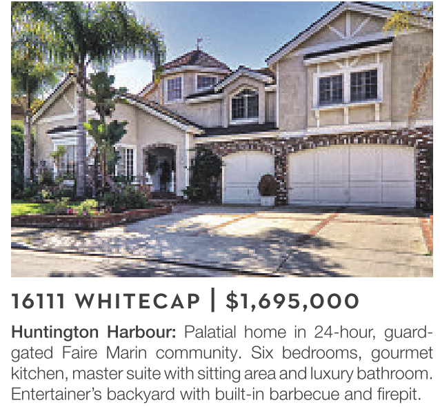 Huntington Harbour: Palatial home in 24-hour, guardgated Faire Marin community. Six bedrooms, gourmet kitchen, master suite with sitting area and luxury bathroom. Entertainer’s backyard with built-in barbecue and firepit.
