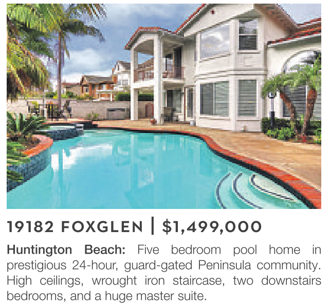 Huntington Beach: Five bedroom pool home in prestigious 24-hour, guard-gated Peninsula community. High ceilings, wrought iron staircase, two downstairs bedrooms, and a huge master suite.
