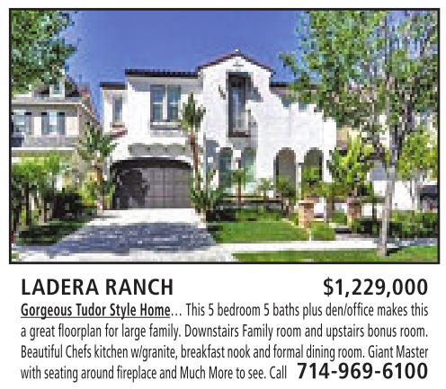 LADERA RANCH $1,229,000 Gorgeous Tudor Style Home… This 5bedroom 5baths plus den/office makes this agreat floorplan for large family. Downstairs Family room and upstairs bonus room. BeautifulChefskitchen w/granite,breakfastnookand formal diningroom. Giant Master with seatingaround fireplace andMuch More to see. Call 714-969-6100