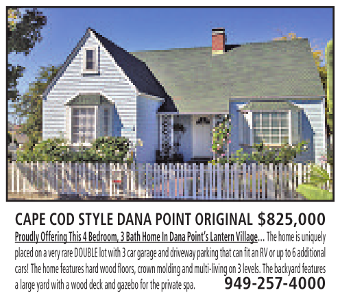 CAPE COD STYLE DANA POINT ORIGINAL $825,000 ProudlyOffering This 4Bedroom,3BathHome In Dana Point’s LanternVillage… Thehome is uniquely placed on averyrareDOUBLElot with 3car garageand driveway parkingthat canfitanRVorupto6additional cars!The home featureshardwood floors, crown molding andmulti-living on 3levels. Thebackyard features alarge yard with awood deck andgazebo for theprivatespa. 949-257-4000
