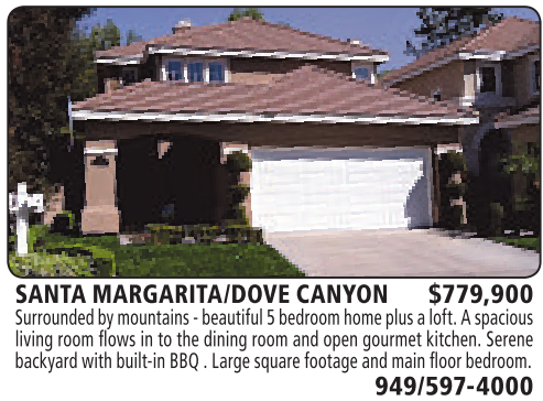 SANTA MARGARITA/DOVE CANYON $779,900 Surrounded by mountains -beautiful5bedroomhome plus aloft. Aspacious living room flows in to the dining room and open gourmet kitchen. Serene backyard with built-in BBQ.Large squarefootage andmain floorbedroom. 949/597-4000 See also