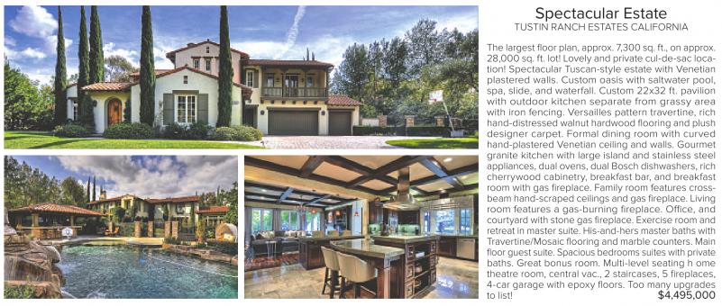 Spectacular Estate TUSTIN RANCH ESTATES CALIFORNIA The largest floor plan, approx. 7,300 sq. ft., on approx. 28,000 sq. ft. lot! Lovely and private cul-de-sac location! Spectacular Tuscan-style estate with Venetian plastered walls. Custom oasis with saltwater pool, spa, slide, and waterfall. Custom 22x32 ft. pavilion with outdoor kitchen separate from grassy area with iron fencing. Versailles pattern travertine, rich hand-distressed walnut hardwood flooring and plush designer carpet. Formal dining room with curved hand-plastered Venetian ceiling and walls. Gourmet granite kitchen with large island and stainless steel appliances, dual ovens, dual Bosch dishwashers, rich cherrywood cabinetry, breakfast bar, and breakfast room with gas fireplace. Family room features crossbeam hand-scraped ceilings and gas fireplace. Living room features a gas-burning fireplace. Office, and courtyard with stone gas fireplace. Exercise room and retreat in master suite. His-and-hers master baths with Travertine/Mosaic flooring and marble counters. Main floor guest suite. Spacious bedrooms suites with private baths. Great bonus room. Multi-level seating h ome theatre room, central vac., 2 staircases, 5 fireplaces, 4-car garage with epoxy floors. Too many upgrades to list! $4,495,000