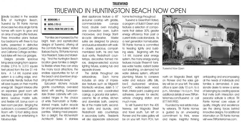 “Families are impressed by the bright, fresh and sophisticated designs at Truewind, offering all the comforts they desire,” stated Barbara Trachy, TRi Pointe Home’s Vice President, Sales and Marketing. “And the Huntington Beach location gives families a delightful lifestyle where they can enjoy the many local attractions, the endless opportunities for fun at the beach and downtown shopping all just minutes away.”