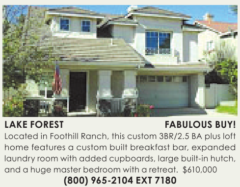 LAKE FOREST FABULOUS BUY! Located inFoothill Ranch, this custom 3BR/2.5 BAplus loft home features acustom built breakfast bar, expanded laundry room with added cupboards, large built-in hutch, and ahuge master bedroom with aretreat. $610,000 (800)965-2104 EXT 7180