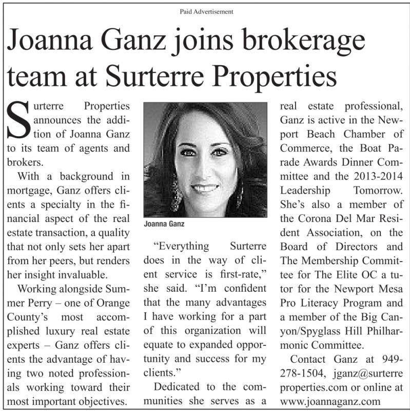 Paid Advertisement Joanna Ganz joins brokerage team at Surterre Properties Surterre Properties announces the addition of Joanna Ganz to its team of agents and brokers. With a background in mortgage, Ganz offers clients a specialty in the financial aspect of the real estate transaction, a quality that not only sets her apart from her peers, but renders her insight invaluable. Working alongside Summer Perry – one of Orange County’s most accomplished luxury real estate experts – Ganz offers clients the advantage of having two noted professionals working toward their most important objectives. Joanna Ganz “Everything Surterre does in the way of client service is first-rate,” she said. “I’m confident that the many advantages I have working for a part of this organization will equate to expanded opportunity and success for my clients.” Dedicated to the communities she serves as a real estate professional, Ganz is active in the Newport Beach Chamber of Commerce, the Boat Parade Awards Dinner Committee and the 2013-2014 Leadership Tomorrow. She’s also a member of the Corona Del Mar Resident Association, on the Board of Directors and The Membership Committee for The Elite OC a tutor for the Newport Mesa Pro Literacy Program and a member of the Big Canyon/Spyglass Hill Philharmonic Committee. Contact Ganz at 949- 278-1504, jganz@surterre properties.com or online at www.joannaganz.com See also