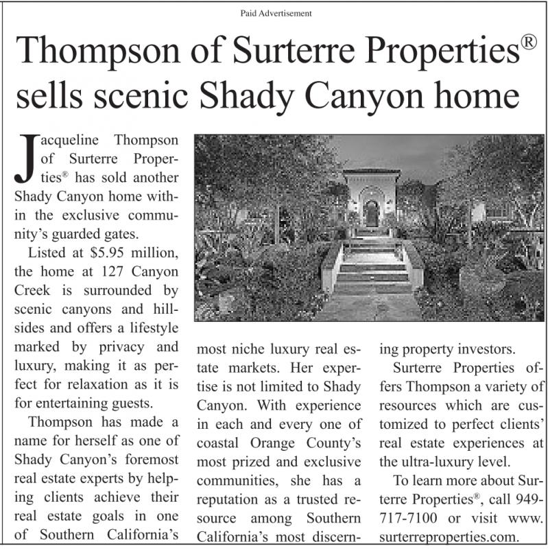 Thompson of Surterre Properties ® has sold another Shady Canyon home within the exclusive community’s guarded gates.
