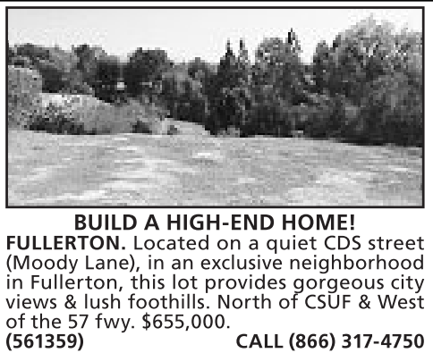 BUILD A HIGH-END HOME! FULLERTON. Located on a quiet CDS street (Moody Lane), in an exclusive neighborhood in Fullerton, this lot provides gorgeous city views & lush foothills. North of CSUF & West of the 57 fwy. $655,000. (561359) CALL (866) 317-4750