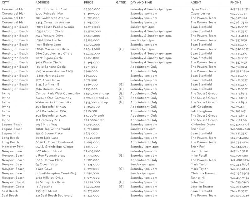CITY ADDRESS PRICE GATED DAY AND TIME AGENT PHONE Corona del Mar 4721 Dorchester Road $3,550,000 Saturday & Sunday 1pm-4pm Dylan Mason 949.294.7832 Corona del Mar 2720 Point del Mar $1,499,000 Saturday 1pm-4pm Casey Lesher 949.702.7211 Corona del Mar 707 Goldenrod Avenue $1,295,000 Saturday 1pm-4pm The Powers Team 714.342.1194 Corona del Mar 441.5 Carnation Avenue $1,195,000 Saturday 1pm-4pm The Powers Team 949.981.7570 Huntington Beach 17071 South Pacific Avenue $4,950,000 Sunday 1pm-4pm Sean Stanfield 714.421.3377 Huntington Beach 16532 Cotuit Circle $4,500,000 Saturday & Sunday 1pm-4pm Sean Stanfield 714.421.3377 Huntington Beach 3522 Venture Drive $3,895,000 Saturday & Sunday 1pm-4pm The Powers Team 714.814.4663 Huntington Beach 16592 Nalu Circle $3,199,000 Sunday 1pm-4pm The Powers Team 714.357.1031 Huntington Beach 17011 Bolero Lane $2,995,000 Saturday 1pm-4pm Sean Stanfield 714.421.3377 Huntington Beach 17046 Marina Bay Drive $2,549,000 [G] Sunday 1pm-4pm The Powers Team 714.390.6337 Huntington Beach 6891 Steeplechase Circle $2,375,000 Saturday & Sunday 1pm-4pm Sean Stanfield 714.421.3377 Huntington Beach 4022 Figaro Circle $2,185,000 Saturday & Sunday 1pm-4pm Sean Stanfield 714.421.3377 Huntington Beach 3672 Pirate Circle $1,495,000 Saturday & Sunday 1pm-4pm The Powers Team 714.357.1031 Huntington Beach 16052 Bonaire Circle $975,000 Appointment Only The Powers Team 714.357.1031 Huntington Beach 4167 Warner Avenue #205 $969,000 Appointment Only The Powers Team 562.592.2946 Huntington Beach 16866 Harvest Lane $894,900 Saturday 1pm-4pm Sean Stanfield 714.421.3377 Huntington Beach 5176 Acorn Drive $879,500 Saturday 1pm-4pm Sean Stanfield 714.421.3377 Huntington Beach 8125 Surfline – B $489,000 [G] Saturday 1pm-4pm Sean Stanfield 714.421.3377 Huntington Beach 5146 Dorado Drive $255,000 [G] Saturday 1pm-4pm Sean Stanfield 714.421.3377 Irvine Central Park West Community $450,000 and up [G] Appointment Only The Soussé Group 714.412.8512 Irvine Avenue One Community $328,000 and up [G] Appointment Only The Soussé Group 714.412.8512 Irvine Watermarke Community $315,000 and up [G] Appointment Only The Soussé Group 714.412.8512 Irvine 402 Rockefeller #302 $1,250,000 Appointment Only Jeff Caughren 714.797.6151 Irvine 402 Rockefeller #304 $928,888 Appointment Only Jeff Caughren 714.797.6151 Irvine 402 Rockefeller #305 $3,700/month Appointment Only The Soussé Group 714.412.8512 Irvine 21 Gramercy #419 $2,900/month Appointment Only The Soussé Group 714.412.9014 Laguna Beach 2658 Nido Way $2,650,000 Saturday 1pm-4pm Kimberlee Drake 949.500.7108 Laguna Beach 28812 Top Of the World $1,799,000 Sunday 2pm-4pm Brian Rich 949.500.4668 Laguna Hills 25416 Boone Place $875,000 Saturday 1pm-4pm Sean Stanfield 714.421.3377 Long Beach 6020 Lido Lane $7,495,000 Saturday 1pm-4pm The Powers Team 562.754.4104 Long Beach 6020 E. Ocean Boulevard $1,695,000 Appointment Only The Powers Team 562.754.4104 Monterey Park 557 S. Grandridge Avenue $625,000 Saturday 12pm-4pm Brian Fox 714.348.1085 Newport Beach 807 Aleppo Street $2,465,000 Saturday 1pm-4pm Brad Hinman 949.246.3221 Newport Beach 9 Rue Fountainbleau $1,795,000 [G] Saturday 1pm-4pm Mike Postil 949.903.1210 Newport Beach 1600 Harrow Place $1,595,000 Appointment Only The Powers Team 949.400.8254 Newport Beach 65 Ocean Vista $1,425,000 Sunday 1pm-4pm Mark Taylor 949.335.8698 Newport Beach 6 Sea Cove $1,299,000 [G] Saturday 1pm-4pm Mark Taylor 949.335.8698 Newport Beach 11 Southhampton Court #145 $1,150,000 Sunday 1pm-4pm Christina Harmon 949.236.9305 Newport Beach 2762 Hillview Drive $1,075,000 Saturday 1pm-4pm Tanner Hill 949.433.9563 Newport Coast 54 Sidney Bay Drive $2,799,000 [G] Saturday 1pm-4pm John Cain 714.655.8940 Newport Coast 14 Agostino $2,225,000 [G] Saturday 1pm-4pm Jocelyn Bratter 949.244.5109 Seal Beach 233 15th Street $1,375,000 Saturday 1pm-4pm Sean Stanfield 714.421.3377 Seal Beach 321 Seal Beach Boulevard $1,235,000 Saturday 1pm-4pm The Powers Team 562.592.2946