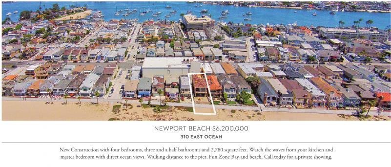 NEWPORT BEACH $6,200,000 310 east ocean New Construction with four bedrooms, three and a half bathrooms and 2,780 square feet. Watch the waves from your kitchen and master bedroom with direct ocean views. Walking distance to the pier, Fun Zone Bay and beach. Call today for a private showing.