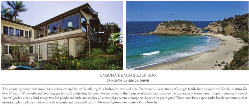 14 LAGUNA BEACH $3,350,000 27 north la senda drive This charming ocean view home has a classic cottage feel while offering four bedrooms, two and a half bathrooms. Generations of a single family have enjoyed this fabulous setting for over 60 years. While lush and blooming gardens and a bubbling koi pond welcome you to this home, you're also captivated by the panorama of ocean vistas. Property consists of several "secret" garden areas, a bird aviary, two koi ponds, and lush landscaping all created for a serene atmosphere. Located in guard gated Three Arch Bay, a spectacular beach community, that includes a play park for children as well as tennis and basketball courts. For more information, contact Patsy Gamble.
