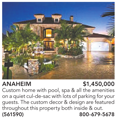 ANAHEIM $1,450,000 Custom home with pool, spa & all the amenities on aquietcul-de-sacwithlotsofparking foryour guests.The custom decor &design are featured throughout this property both inside&out. (561590) 800-679-5678
