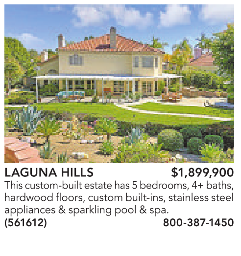 LAGUNA HILLS $1,899,900 This custom-built estate has5bedrooms, 4+ baths, hardwood floors, custom built-ins,stainless steel appliances&sparkling pool &spa. (561612) 800-387-1450