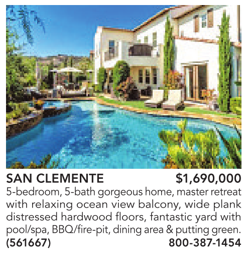SAN CLEMENTE $1,690,000 5-bedroom,5-bathgorgeoushome, master retreat with relaxing ocean view balcony, wide plank distressed hardwood floors, fantastic yard with pool/spa,BBQ/fire-pit,diningarea&putting green. (561667) 800-387-1454