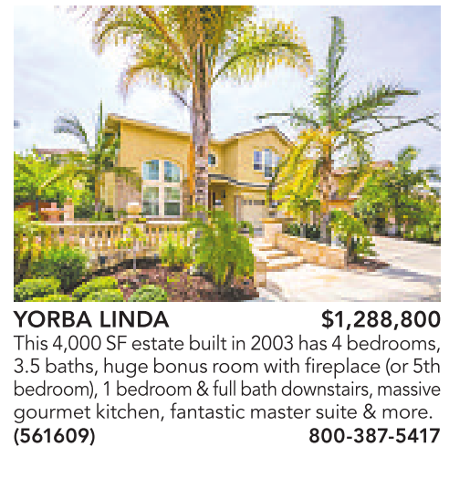 YORBA LINDA $1,288,800 This 4,000 SF estate builtin2003has 4bedrooms, 3.5baths,hugebonus room with fireplace (or5th bedroom), 1bedroom &fullbathdownstairs, massive gourmet kitchen, fantasticmastersuite &more. (561609) 800-387-5417