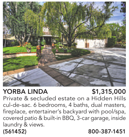 YORBA LINDA $1,315,000 Private & secluded estate on a Hidden Hills cul-de-sac. 6 bedrooms, 4 baths, dual masters, fireplace, entertainer’s backyard with pool/spa, coveredpatio &built-inBBQ, 3-cargarage, inside laundry &views. (561452) 800-387-1451