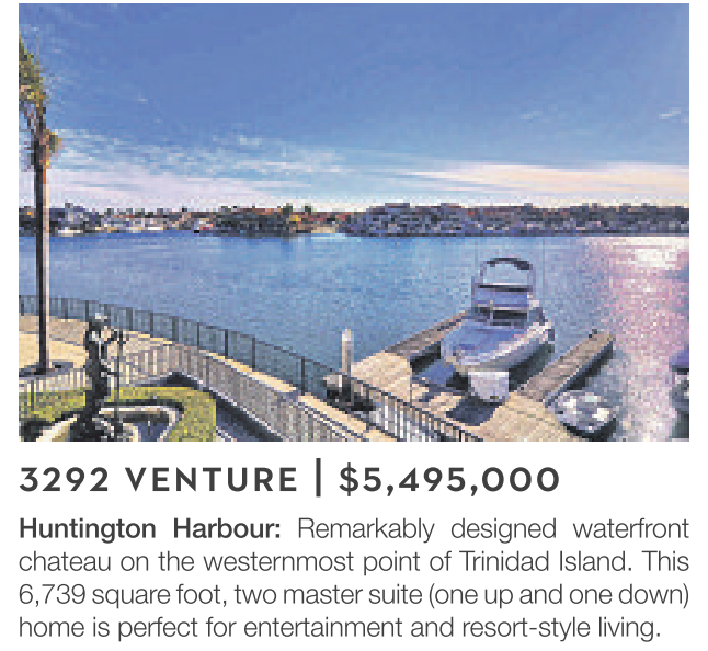 3292 VENTURE | $5,495,000 Huntington Harbour: Remarkably designed waterfront chateau on the westernmost point of Trinidad Island. This 6,739 squarefoot, two master suite (one up and one down) home is perfect for entertainment and resort-style living.