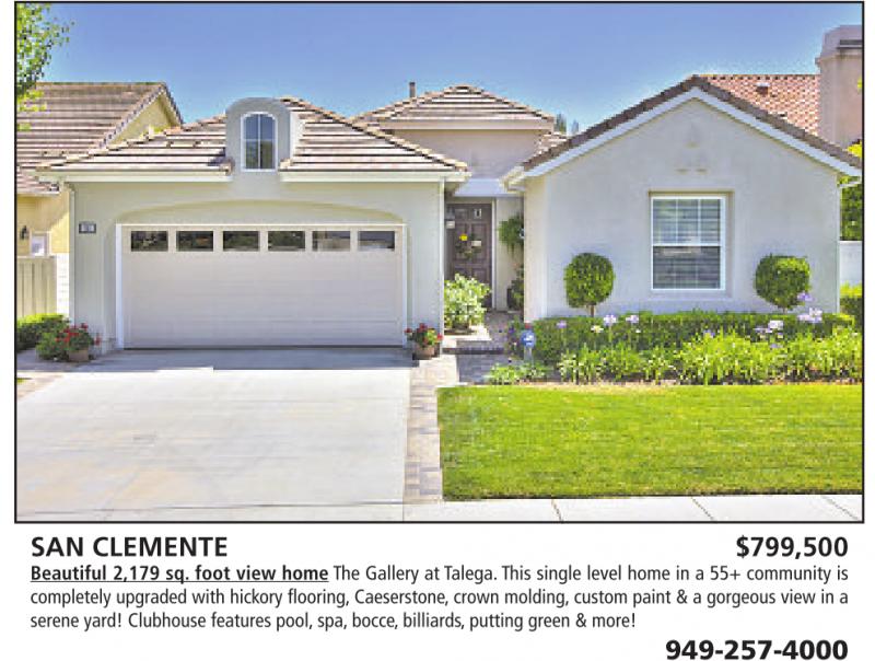 SAN CLEMENTE $799,500 Beautiful 2,179 sq. foot view home The Gallery at Talega. This single level home in a 55+ community is completely upgraded with hickory flooring, Caeserstone,crown molding, custom paint &agorgeous view in a serene yard! Clubhouse features pool, spa, bocce,billiards,putting green &more! 949-257-4000