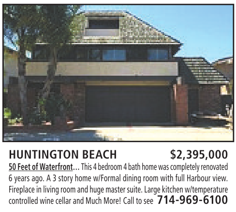 HUNTINGTON BEACH $2,395,000 50 Feet of Waterfront… This 4bedroom4bathhome wascompletelyrenovated 6years ago. A3story home w/Formal dining room with full Harbour view. Fireplace in living room andhugemastersuite. Large kitchen w/temperature controlled wine cellarand Much More!Calltosee 714-969-6100