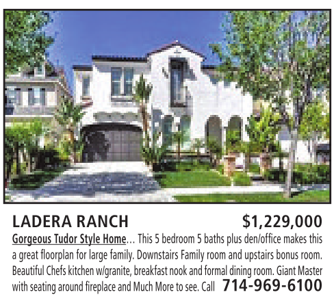 LADERA RANCH $1,229,000 Gorgeous Tudor Style Home… This 5bedroom 5baths plus den/office makes this agreat floorplan for large family. Downstairs Family room and upstairs bonus room. BeautifulChefskitchen w/granite,breakfastnookand formal diningroom. Giant Master with seatingaround fireplace andMuch More to see. Call 714-969-6100