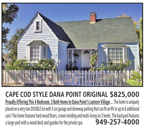 CAPE COD STYLE DANA POINT ORIGINAL $825,000 ProudlyOffering This 4Bedroom,3BathHome In Dana Point’s LanternVillage… Thehome is uniquely placed on averyrareDOUBLElot with 3car garageand driveway parkingthat canfitanRVorupto6additional cars!The home featureshardwood floors, crown molding andmulti-living on 3levels. Thebackyard features alarge yard with awood deck andgazebo for theprivatespa. 949-257-4000