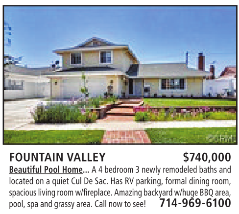FOUNTAIN VALLEY $740,000 Beautiful Pool Home... A4bedroom 3newly remodeled baths and located onaquiet Cul De Sac. Has RVparking, formal dining room, spacious living room w/fireplace.Amazing backyard w/huge BBQarea, pool, spaand grassy area.Callnow to see! 714-969-6100