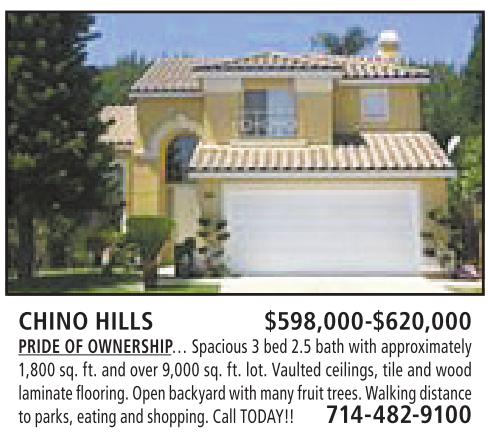 CHINO HILLS $598,000-$620,000 PRIDE OFOWNERSHIP… Spacious 3bed 2.5 bath with approximately 1,800 sq. ft. and over 9,000 sq. ft. lot. Vaulted ceilings, tile and wood laminateflooring.Openbackyard with many fruit trees. Walkingdistance to parks, eatingand shopping. Call TODAY!! 714-482-9100